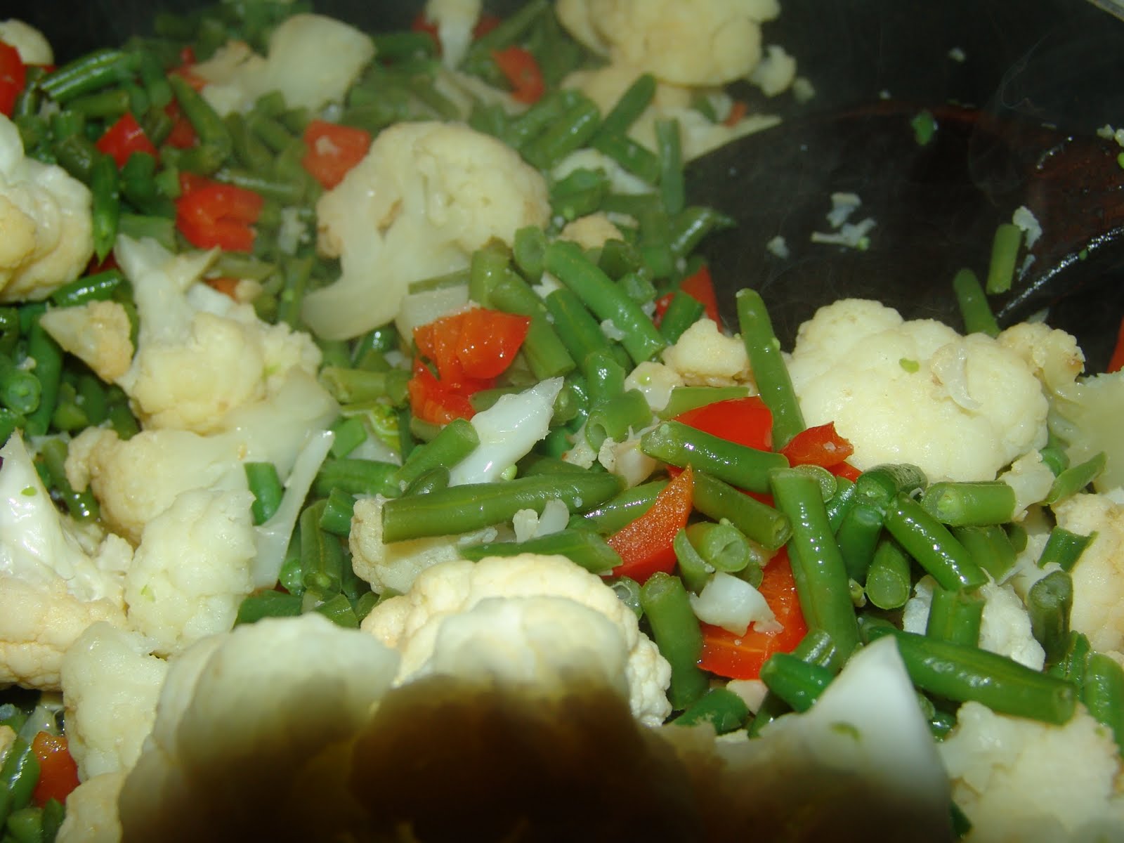 3. add the cauliflower and green beans and fry until the vegetables start to stick to the bottom of the pan (~2 minutes)