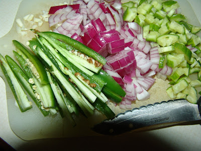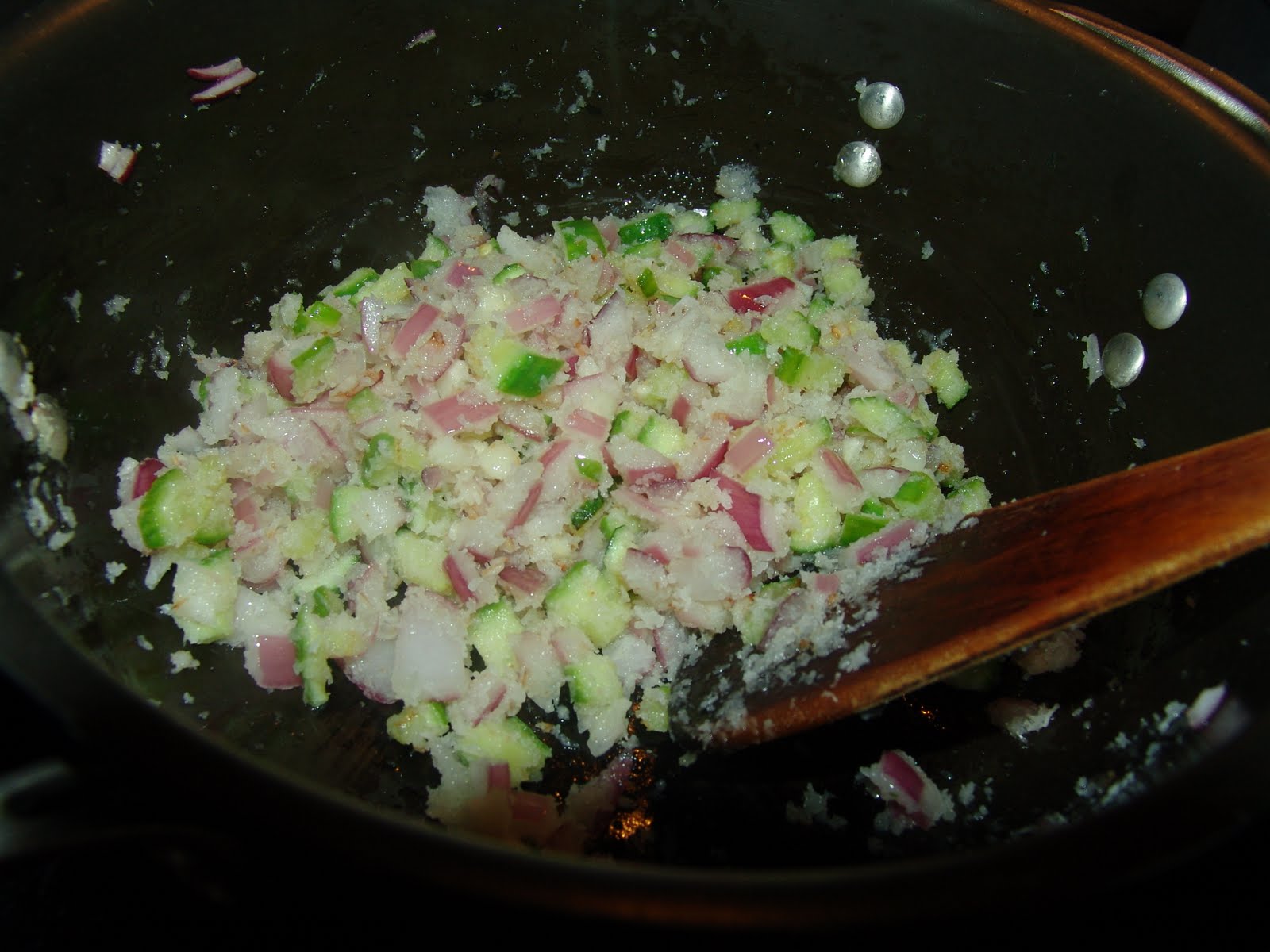 1. fry the onions, garlic, salt, and cucumbers in the oil for ~5 minutes on medium high heat