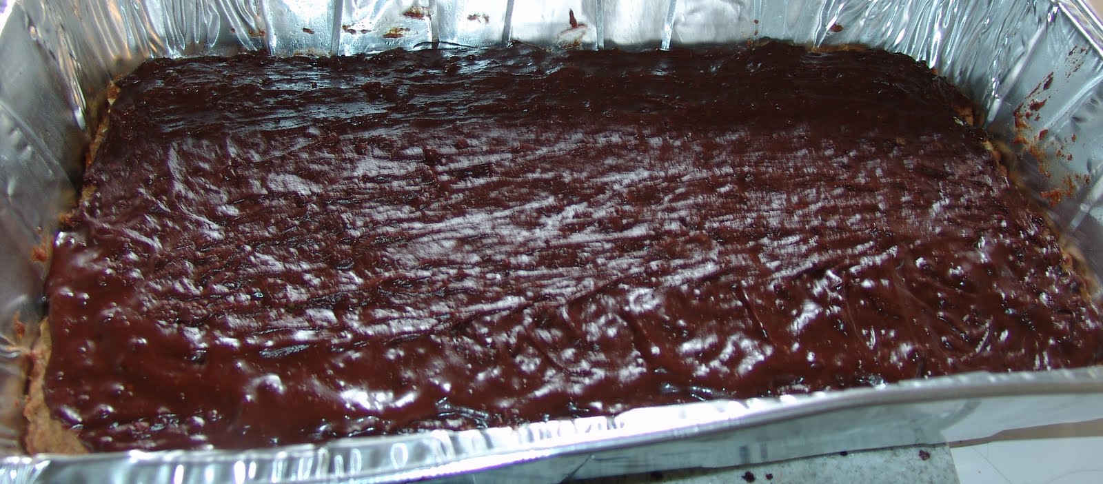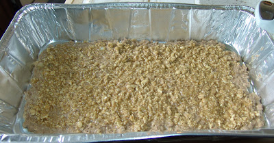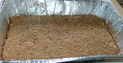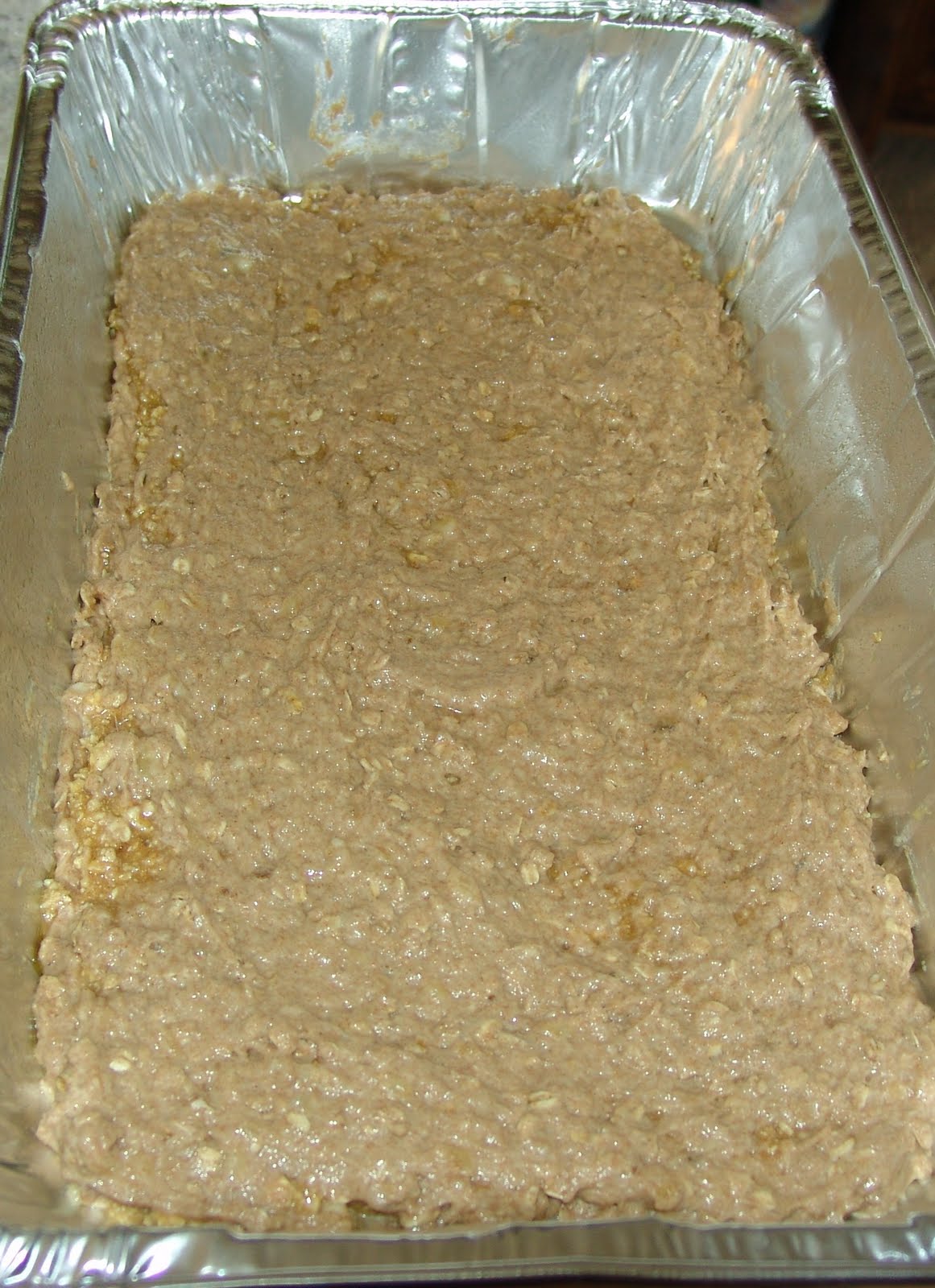 5. spread 1/2 the banana bread batter in a large baking pan (~2 ft X 1.5 ft)