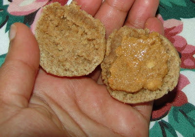 6. cut each cookie in half (like a bun) and fill with the peanut filling