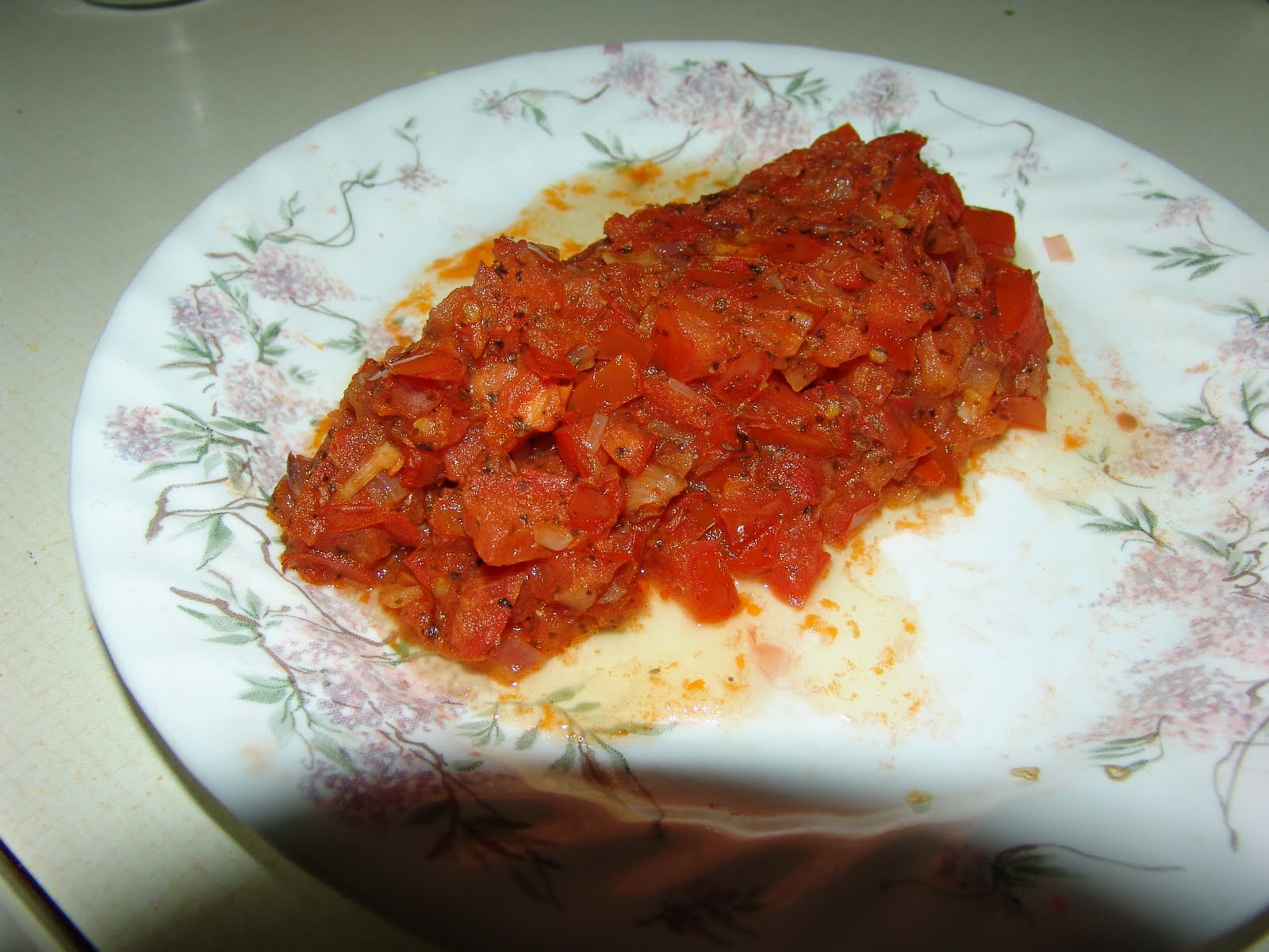 (fry 1/2 red onion diced, 2 tsp salt, 2 garlic cloves minced, and 2 tsp Italian dried herbs in 2 tbsp olive oil for ~3 minutes on high heat; add 5 roma tomatos diced and fry for ~10 minutes uncovered stirring continuously)
