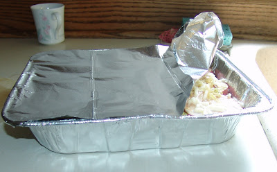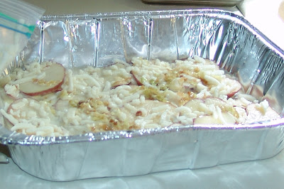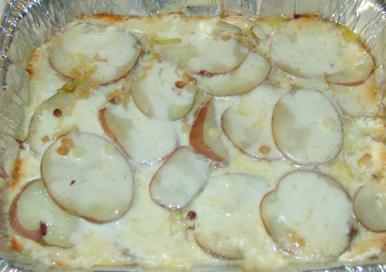 5. cover pan with foil and bake for ~1 hr at 350 degrees F (for some reason it took ~2 hrs for this to bake in our oven; so check after 1 hr and every 15 minutes afterwards until the potatoes are baked thoroughly)