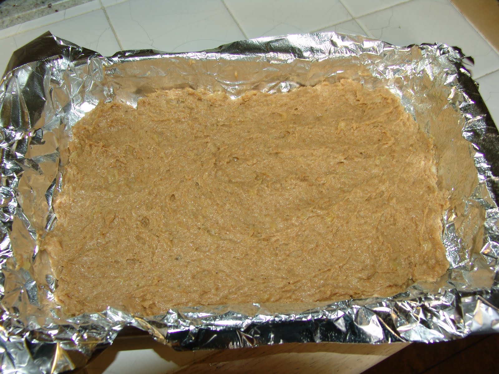 4. spread the crust onto an olive oil-sprayed foil-lined cake pan