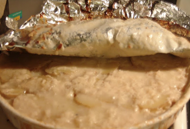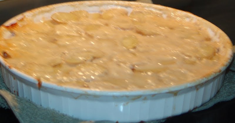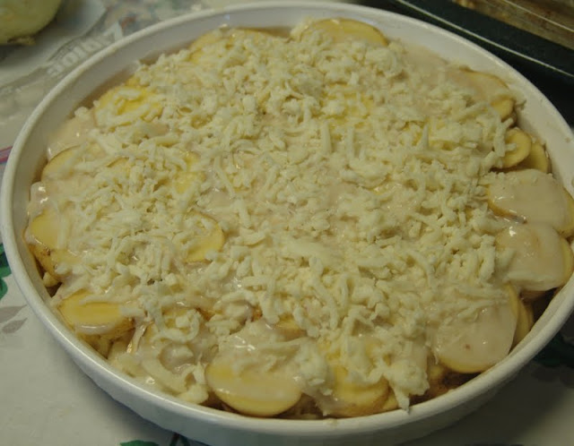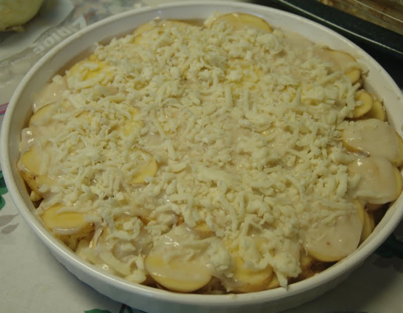 2. layer sliced potatoes, cheese, and white sauce in a baking pan