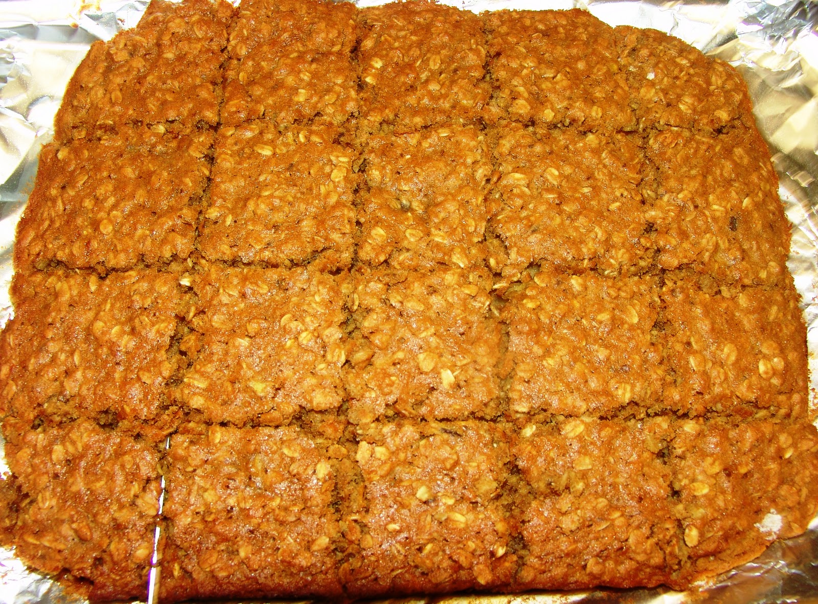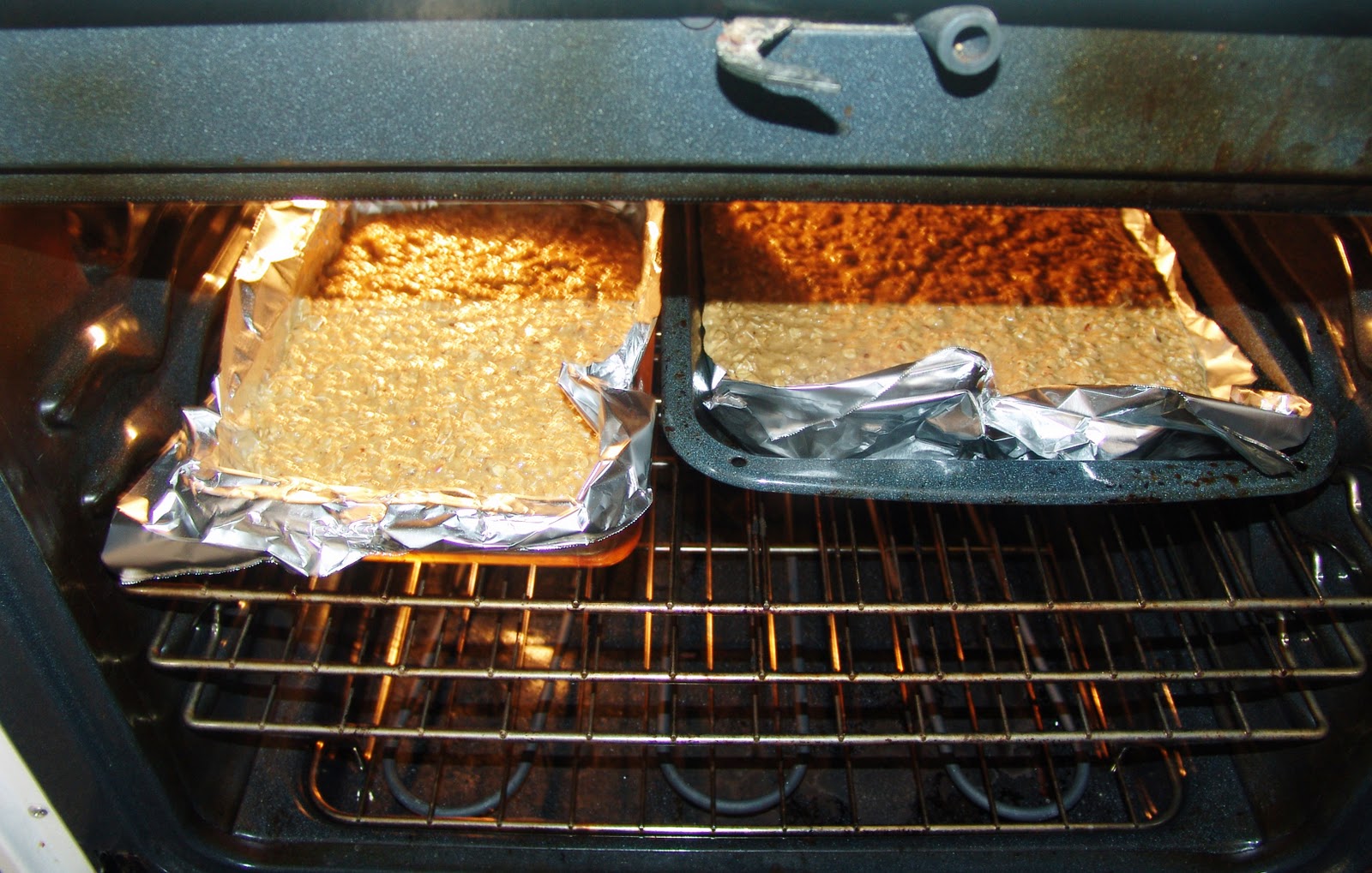 4. pour into two olive oil-sprayed foil-lined cake trays