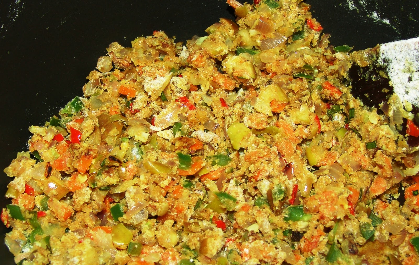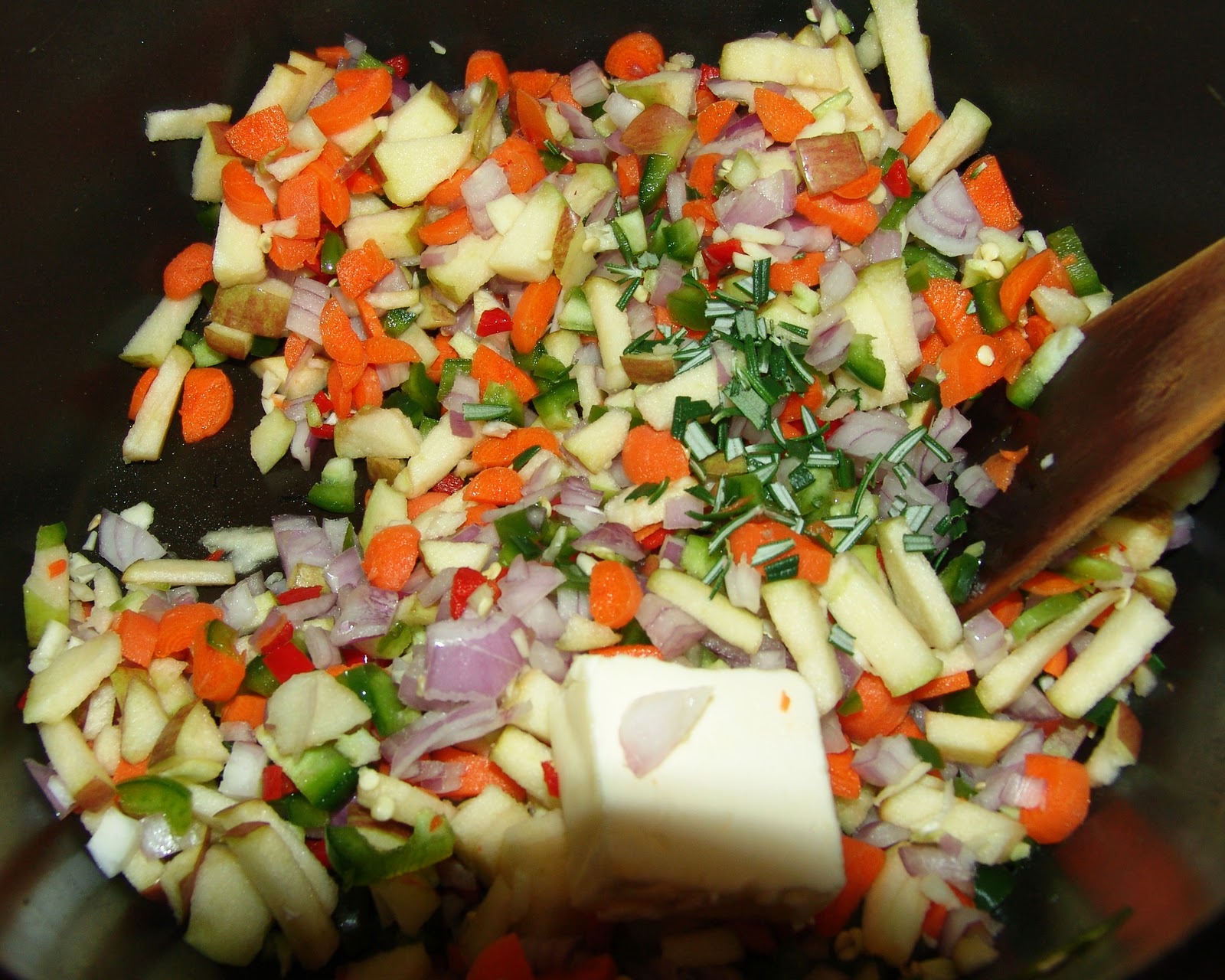 1. cook the vegetables, apples, salt, pepper, and curry powder in the butter for ~ 5 minutes under medium-high heat