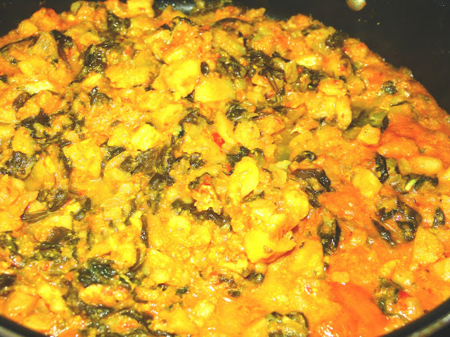 2. add the spinach, cilantro, and potatoes and continue frying for ~ 5 minutes