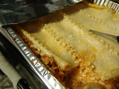 1. lay lasagna noodles flat onto the surface of a large metal baking tray (6 noodles)