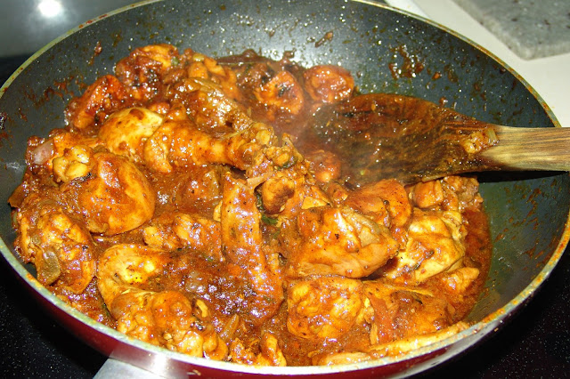 3. add the chicken, salt, and turmeric and fry until the outside of the chicken is almost burned